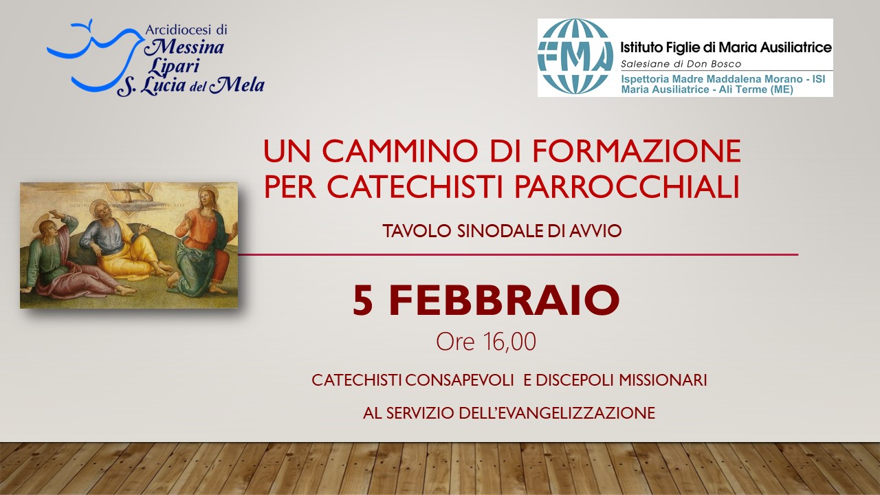 Sabato 5 febbraio alle ore 16,00 si darà avvio al Cammino di formazione per Catechisti parrocchiali presso l’istituto Maria Ausiliatrice di Alì Terme, dal titolo “Catechisti consapevoli e Discepoli missionari al servizio dell’Evangelizzazione“.